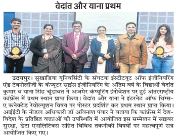 Congratulations to our CSE final-year students of IET Udaipur, MLSU- Vedant Kumar and Yana Singh, for securing 1st position in the poster presentation on "The Internet of Things: A Connected Revolution" at the International Conference on Computing Innovations (ICCI 2025) in Ajmer!